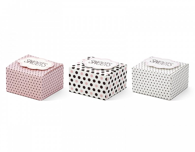 6-pakning gaveesker med søtsaker-tema. Eskene kommer i 3x2 assorterte farger og måler omtrent 6x5x4 cm.