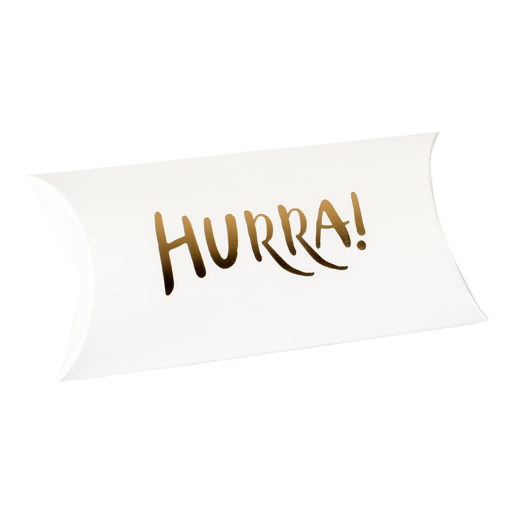 En gaveeske i hvitt, 2-pakning, med den gullfargede teksten «Hurra»! Perfekt til alle festlige anledninger og utmerket til å gjemme små gaver i!