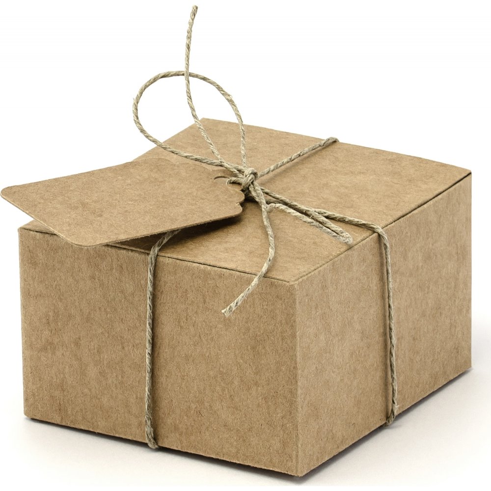 10-pakning gaveesker i naturfarget papp. Leveres med en liten merkelapp å skrive på, samt 6,5 m hyssing.