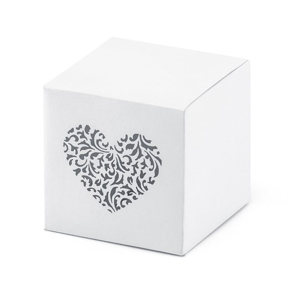 10-pakning med gaveesker i hvitt med et dekorativt hjerte.