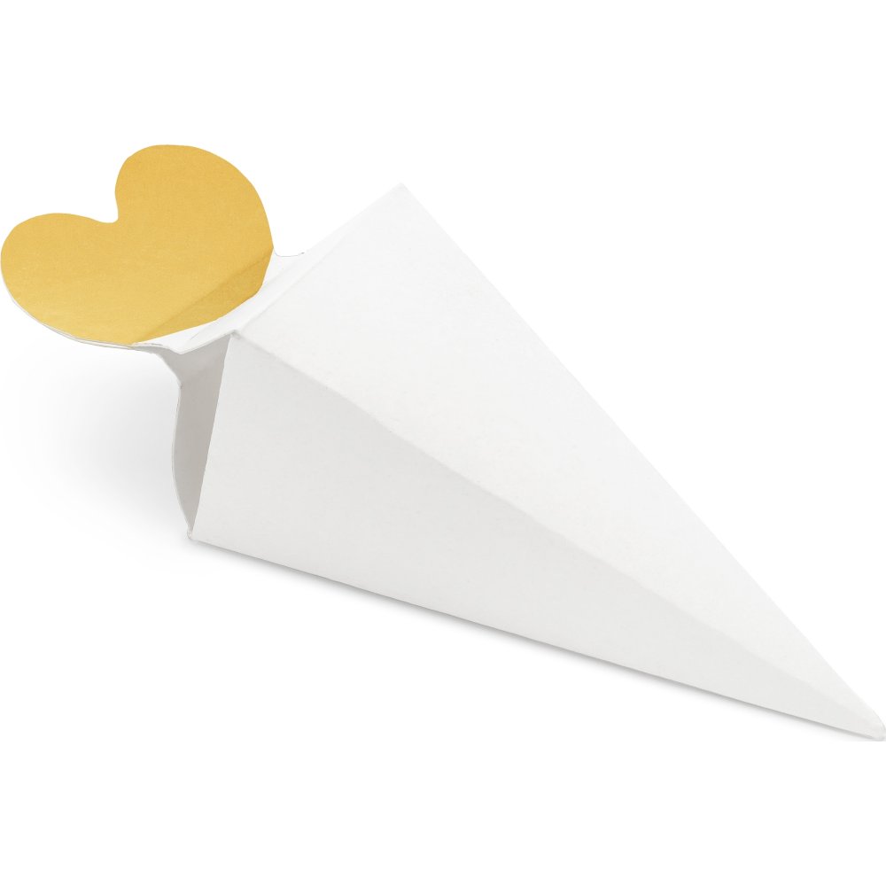 6-pakning med gaveesker formet som kjegler med dekorative gullhjerter.