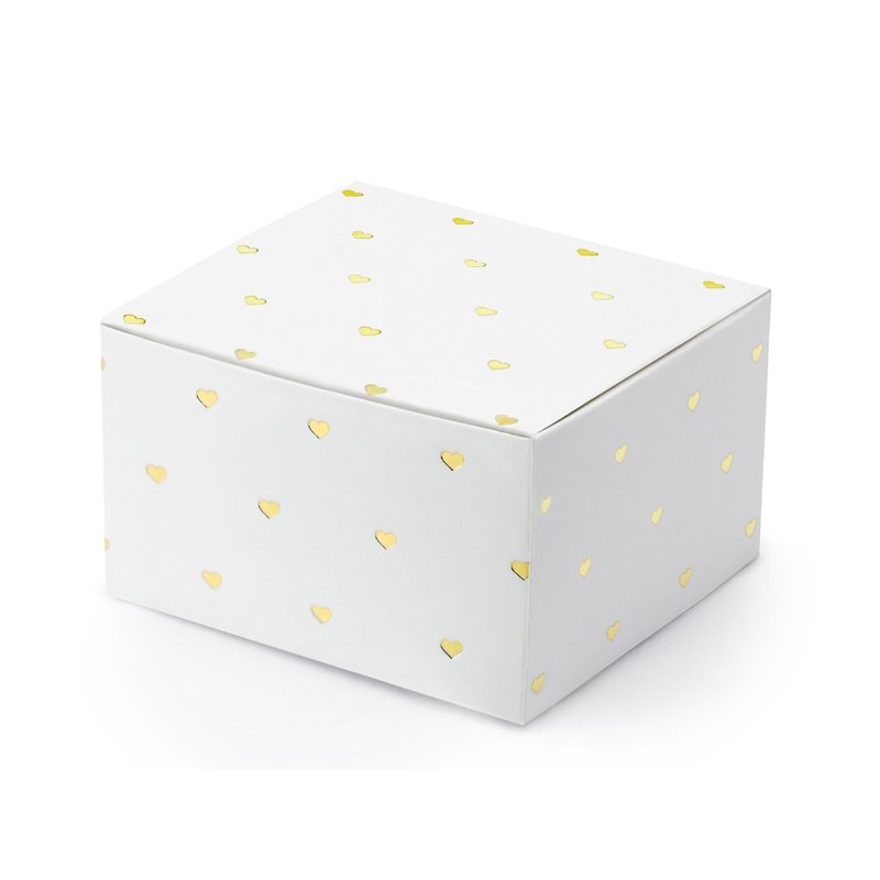 10-pakning med hvite gaveesker med små gullhjerter.