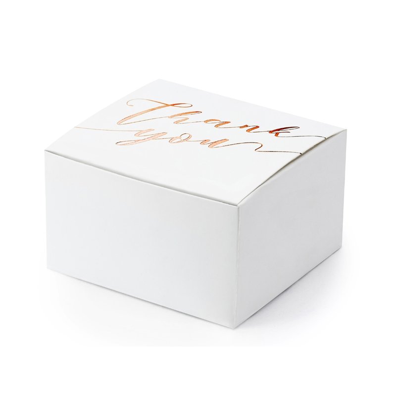 10-pakning med hvite gaveesker med teksten «Takk» skrevet i roségull. Så vakkert til bryllupsborddekking med en liten gave inni.