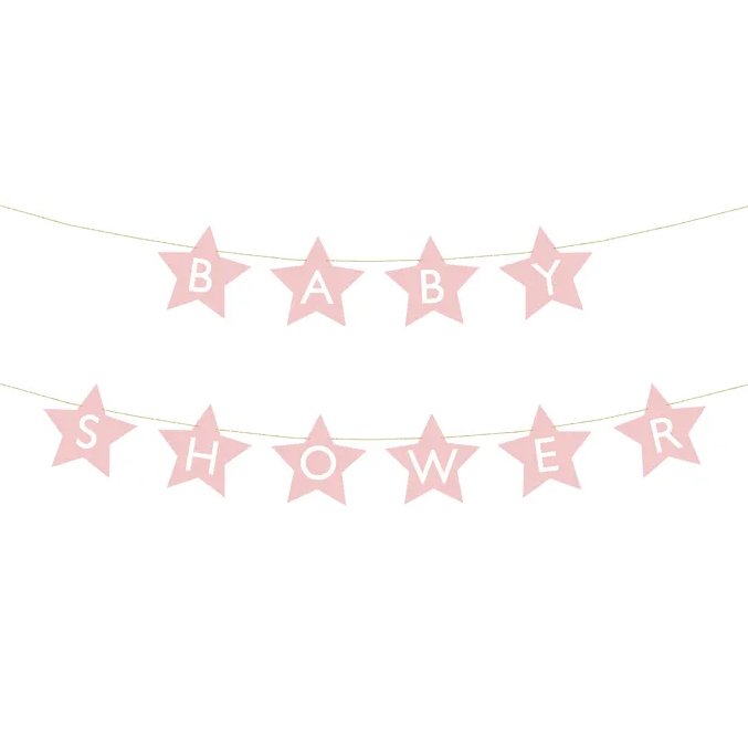 Superfin girlander med rosa stjerner og teksten «Baby Shower». Perfekt som pynt på babyshoweren...
