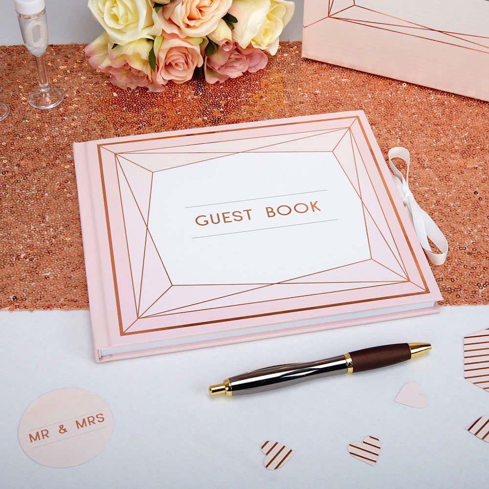 Gjestebok fra temaet «Geo Blush» i pudderrosa og roségull.