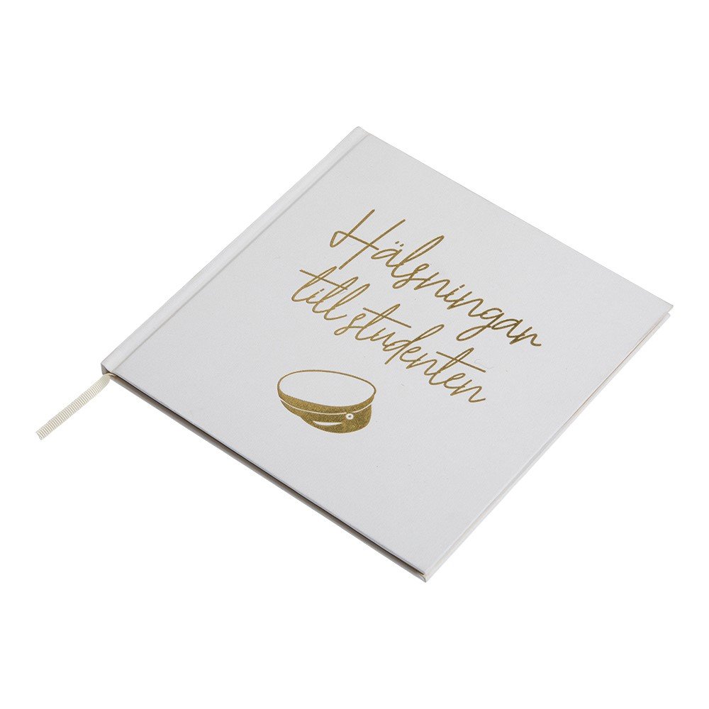 Gjestebok med teksten Hilsen til studenten i gullmetallic. Et supert minne fra en flott dag!