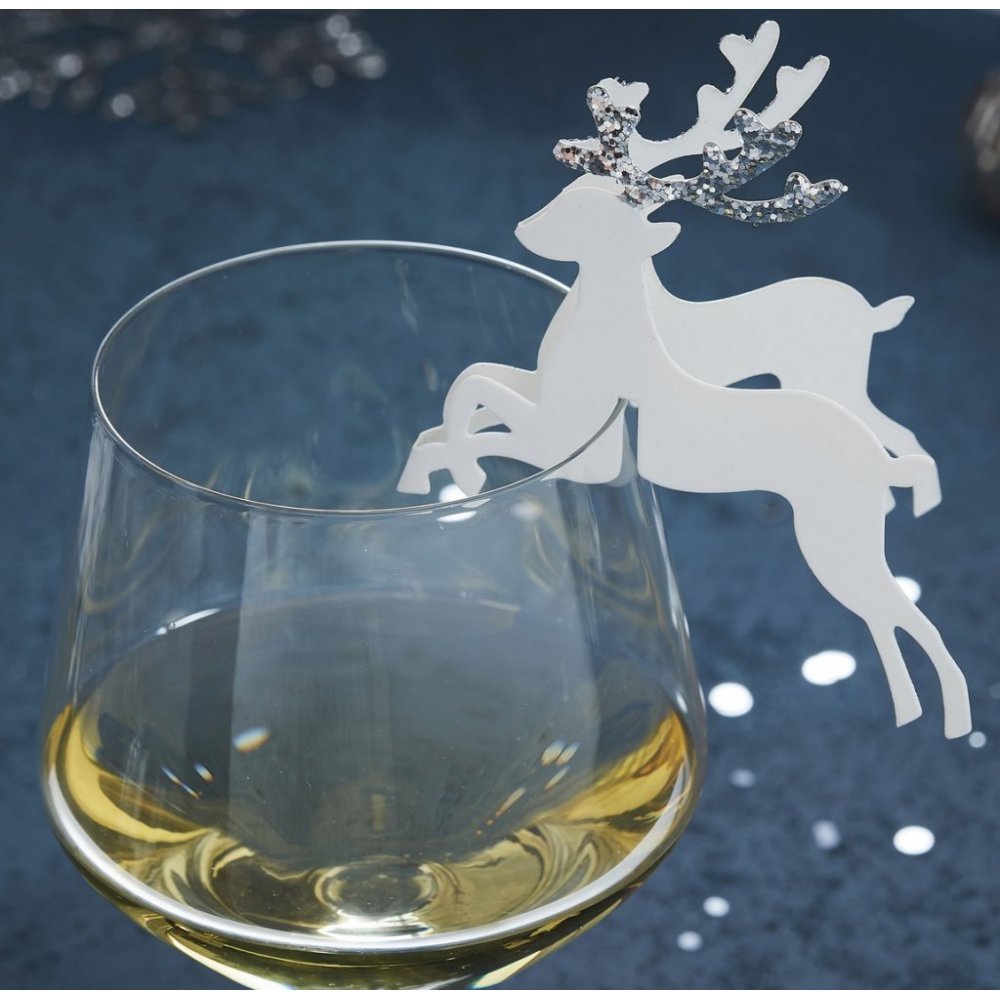 10-pakning med glassdekorasjoner formet som reinsdyr i hvitt med sølvglitrende gevir. Så fint til julebordsdekningen!