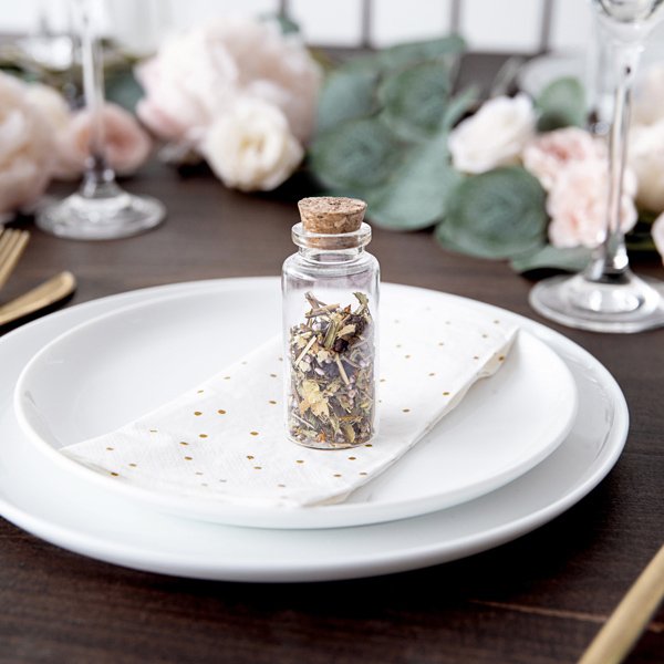 12-pakning med små glassflasker med små korker - så fine til bordplassering, som gaver eller andre fine detaljer på borddekningen.