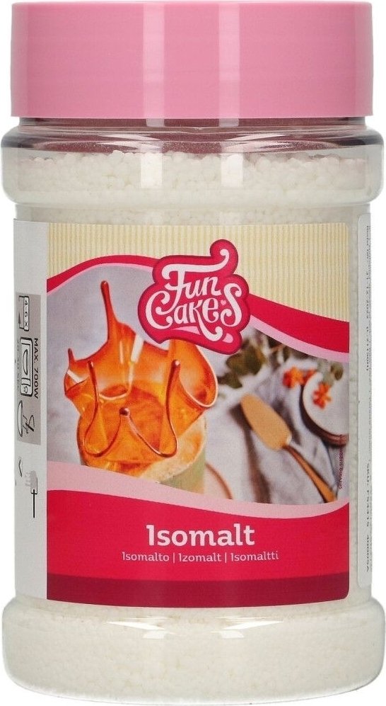 Lag vakre kakedekorasjoner med FunCakes Isomalt - lag klare edelstener, vinduer til for eksempel pepperkakehus, mosaikker osv. Isomalt kan varmes opp uten å miste den søte smaken eller endre farge. Ekstremt egnet for smelting og omforming. Kan brukes som søtningsmiddel - ikke like søtt som sukker, kan blandes med andre søtningsmidler. Ingredienser: Isomalt (100 %) Innhold: 250 gram. Bruk: Smelt i mikrobølgeovnen (ca. 700 W i en varmebestandig bolle) eller i en panne opptil 170 °C. Rør isomalten hvert 20.-30. sekund til den er helt smeltet. Plasser bollen/pannen i en bolle med litt kaldt vann i omtrent 10 sekunder. Isomalten er nå herdet, og du kan farge og bearbeide den slik du ønsker. ADVARSEL!: Den smeltede isomalten er veldig varm!