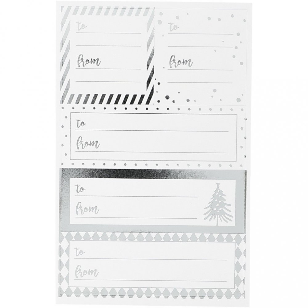 Selvklebende julegaveetiketter med matt overflate og sølvfolietrykk.