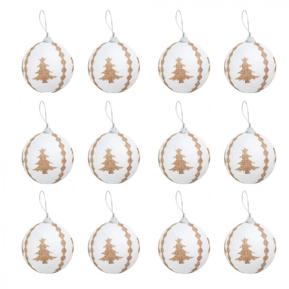 Superfine 12-pakning med julekuler i hvitt, med grantrær i jutestoff!