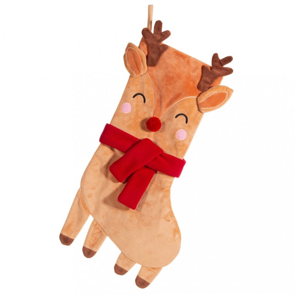 Den søteste julestrømpen formet som et reinsdyr med et rødt skjerf.