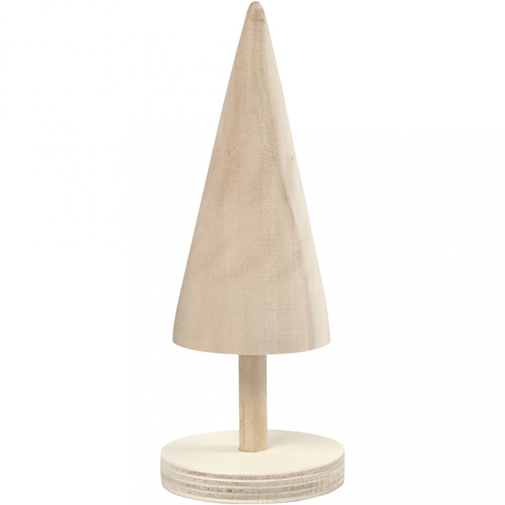 Juletre formet som en kjegle i solid, lyst tre - på trefot. Like morsomt som julehåndverk og pynt.