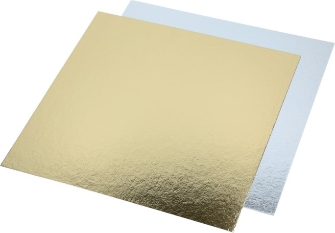 Et firkantet kakefat som måler omtrent 30 x 30 cm. Den ene siden er gullfarget, den andre sølvfarget.