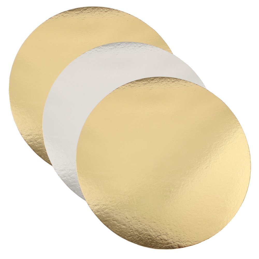 3-pakning med kakebrett av høy kvalitet - den ene siden i gullmetallic og den andre siden i sølvmetallic. Perfekt som kakefat, men også mellom lagene på en etasjekake. Flisene er omtrent 1 mm tykke.