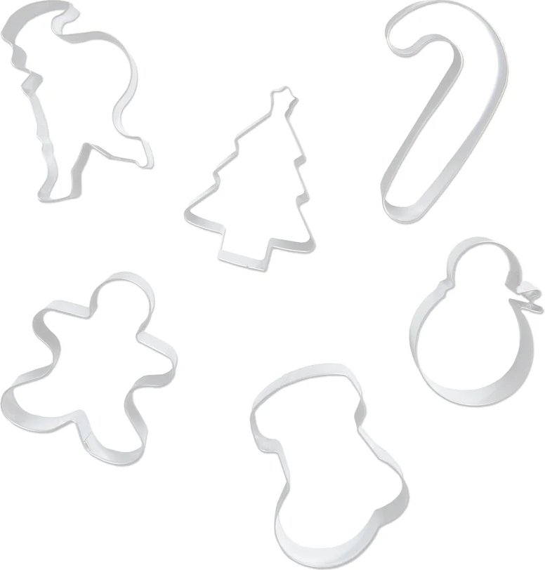 Fine kakeutstikkere for eksempel pepperkaker. Settet inneholder 6 former: julenisse, juletre med stjerne på toppen, sukkerstang, julenisse med sekk, snømann og pepperkakemann.
