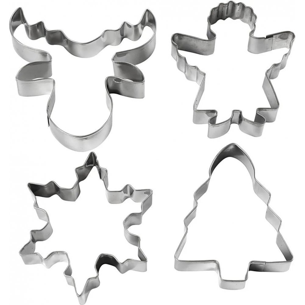 4-pakning med kakeformer i form av et juletre, reinsdyr, engel og snøfnugg.