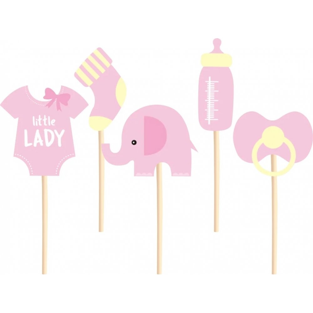 5 fine rosa kakepinner formet som en lyserosa babybody, en liten sokk, en elefantsmokk og en tåteflaske. Supersøt!