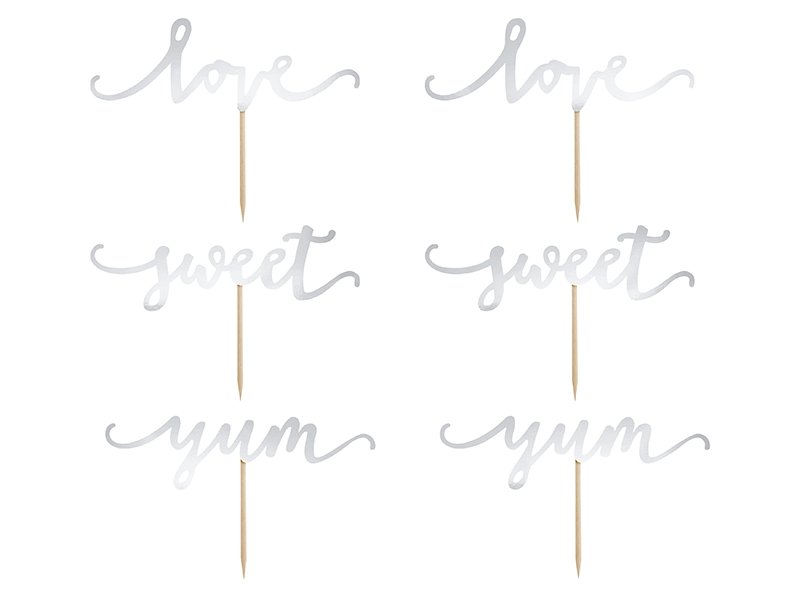 6-pakning kakepinner i sølvmetallic. Plukkene er omtrent 13 cm høye, og emballasjen består av 3 forskjellige design - kjærlighet, søt og nam.