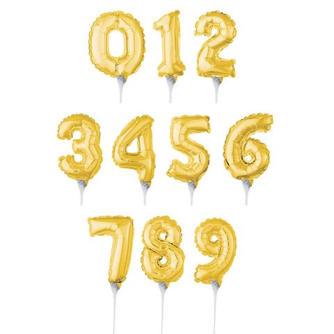 Kaketopper formet som et lite, gullfarget ballongtall. Figuren er omtrent 15 cm høy (pinnen den festes til er omtrent 14,5 cm lang).