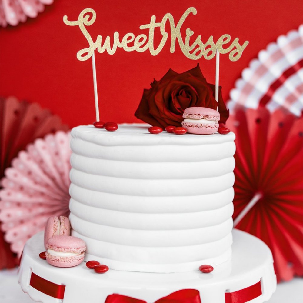 Fin kaketopper i gull med teksten «Sweet Kisses».