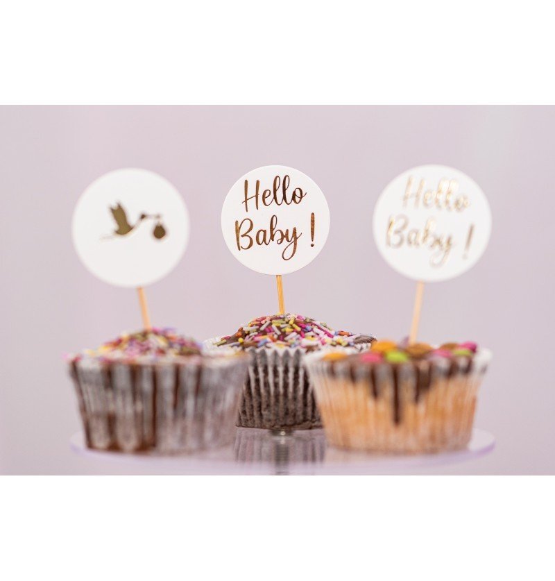 6-pakning kakepinner - Hello Baby - like fine i cupcakesene som på fruktfatet på babyshoweren. Hvit bakgrunn med gulltekst.