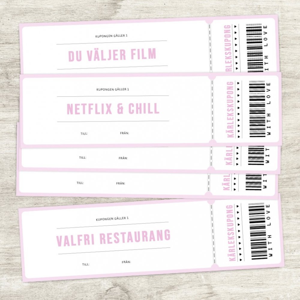 12 kjærlighetskuponger, hvorav 8 er forhåndsskrevne og 4 har plass til dine egne personlige ideer. Klipp ut kupongene, legg dem i en glasskrukke eller en fin eske, pakk dem inn i cellofan, og du har en perfekt gave til Valentinsdagen.