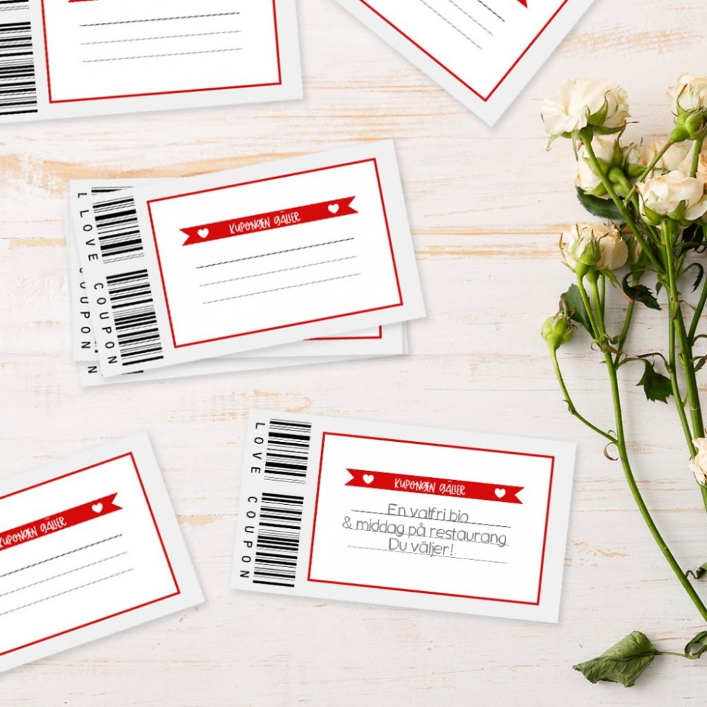 20 kjærlighetskuponger med plass til dine egne oppgaver og gaver. Skriv gavene dine og klipp ut kupongene, legg dem kanskje i en glasskrukke eller en fin eske, pakk dem inn i cellofan, og du har en perfekt gave til Valentinsdagen.