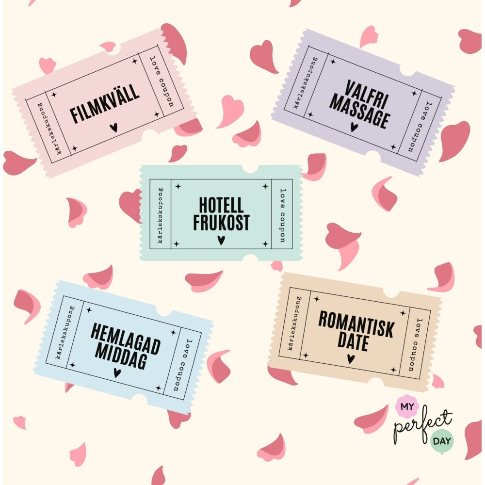 8 forhåndstrykte kjærlighetskuponger med belønninger som: Frokost på sengen, filmkveld og massasje, osv. Klipp ut kupongene, legg dem i en glasskrukke eller en fin eske, pakk dem inn i cellofan, og du har en perfekt gave til Valentinsdagen.