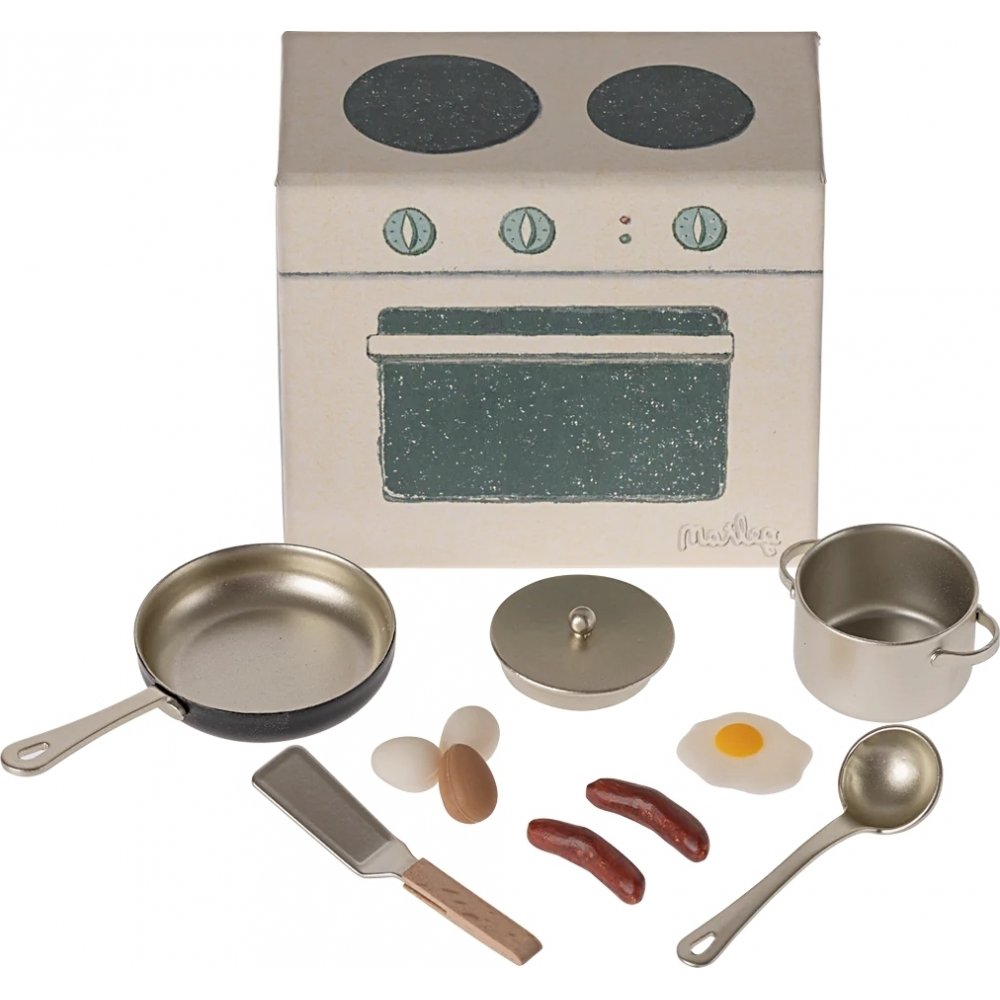 Søtt kjøkkensett med en eske formet som en komfyr med tilhørende gryter og annet kjøkkenutstyr. Perfekt for Maileg-mus og små kaniner.