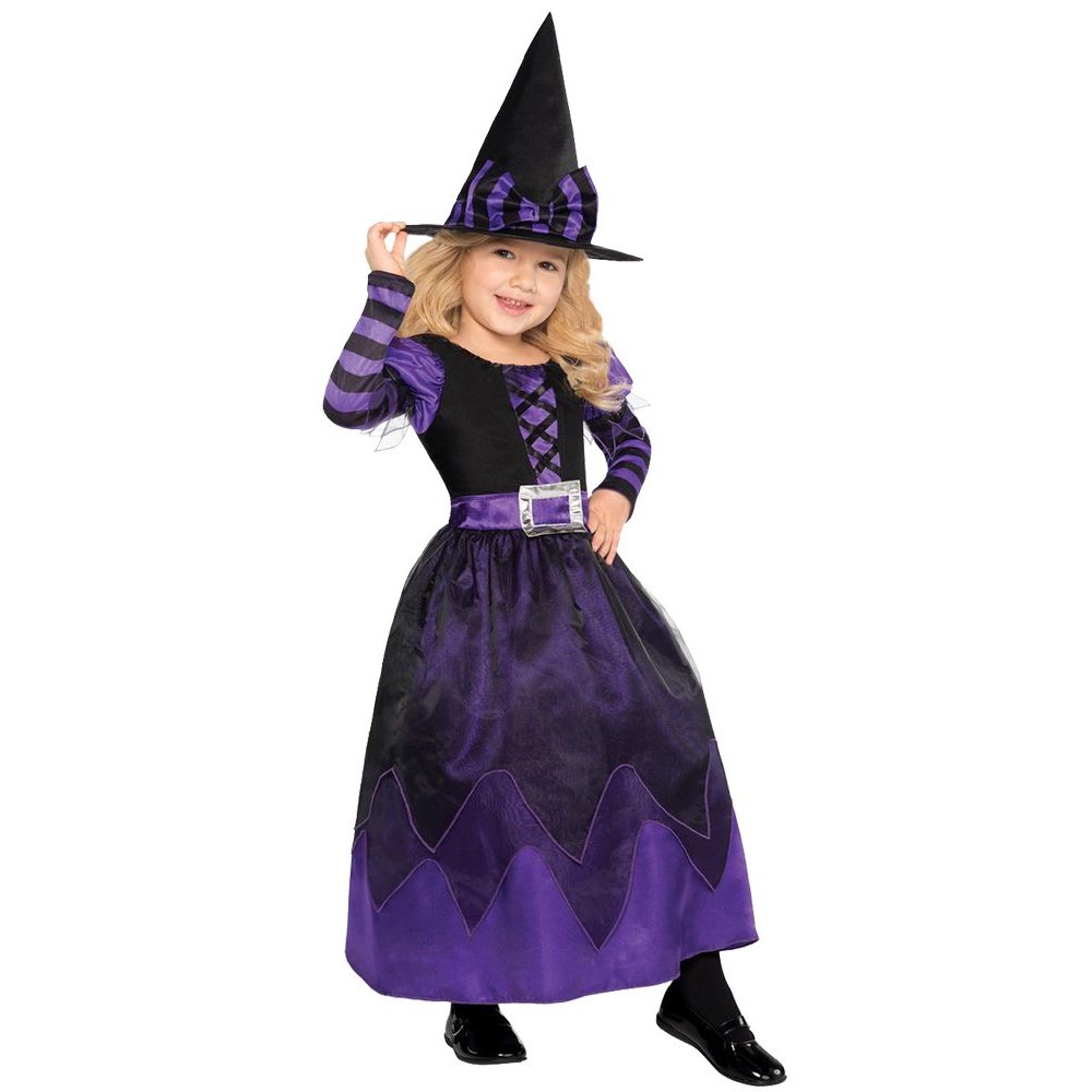 Supersøt sett til den lille heksa! Lengre kjole i lilla og svart med matchende hatt. Perfekt til Halloween-festen eller knask-or-knep.