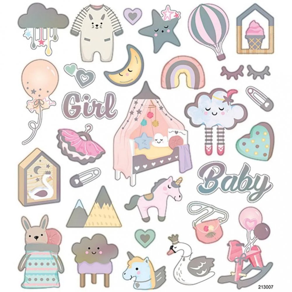 Ark med supersøte klistremerker - Babyjente. Alle klistremerkene er laget av matt papir med skimrende metalliske detaljer. Perfekt til å piffe opp invitasjonskort, gjesteboken til en dåp eller lignende.