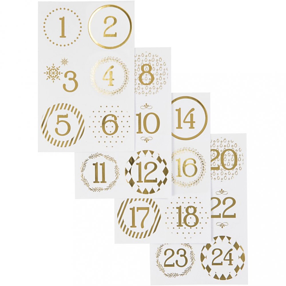 Selvklebende klistremerker med matt overflate og gullmetallisk trykk. Perfekt til våre DIY-adventskalendere!
