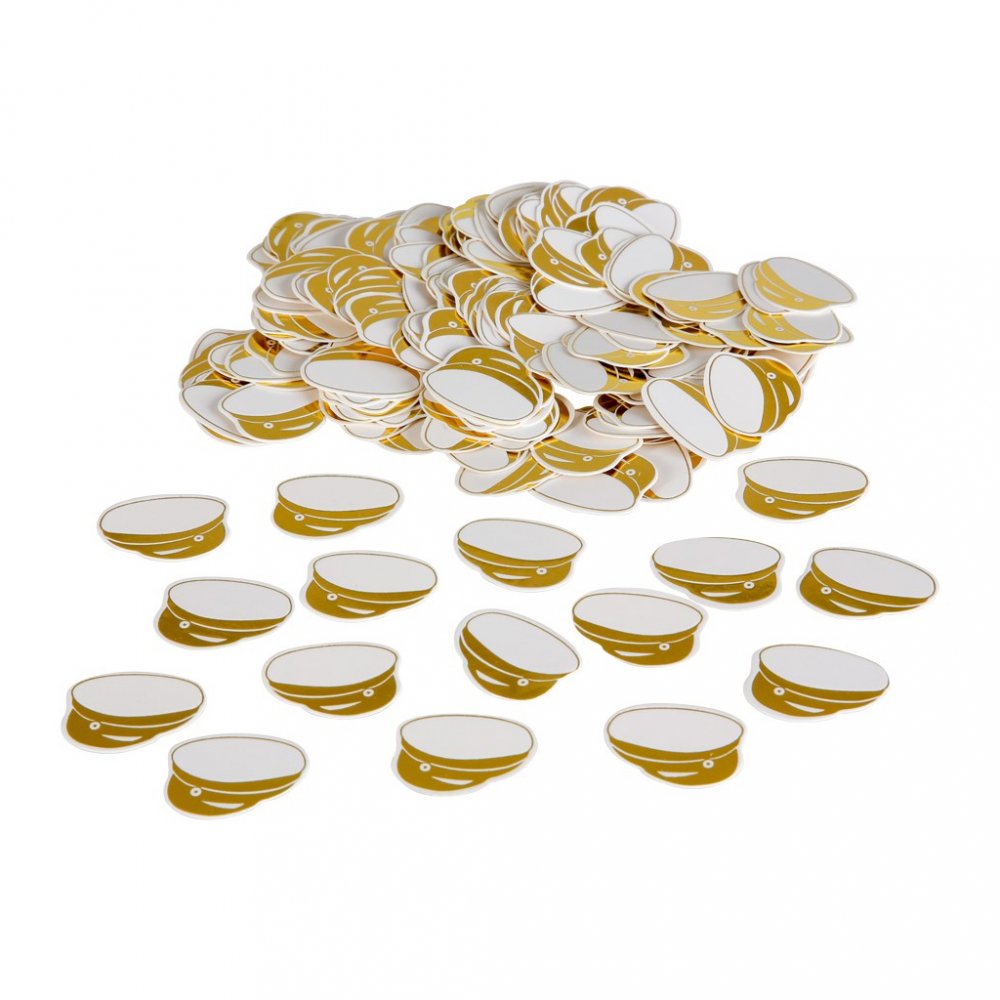 Papirkonfetti formet som gullfargede konfirmasjonsluer - perfekt til pynting på en konfirmasjonsfest.