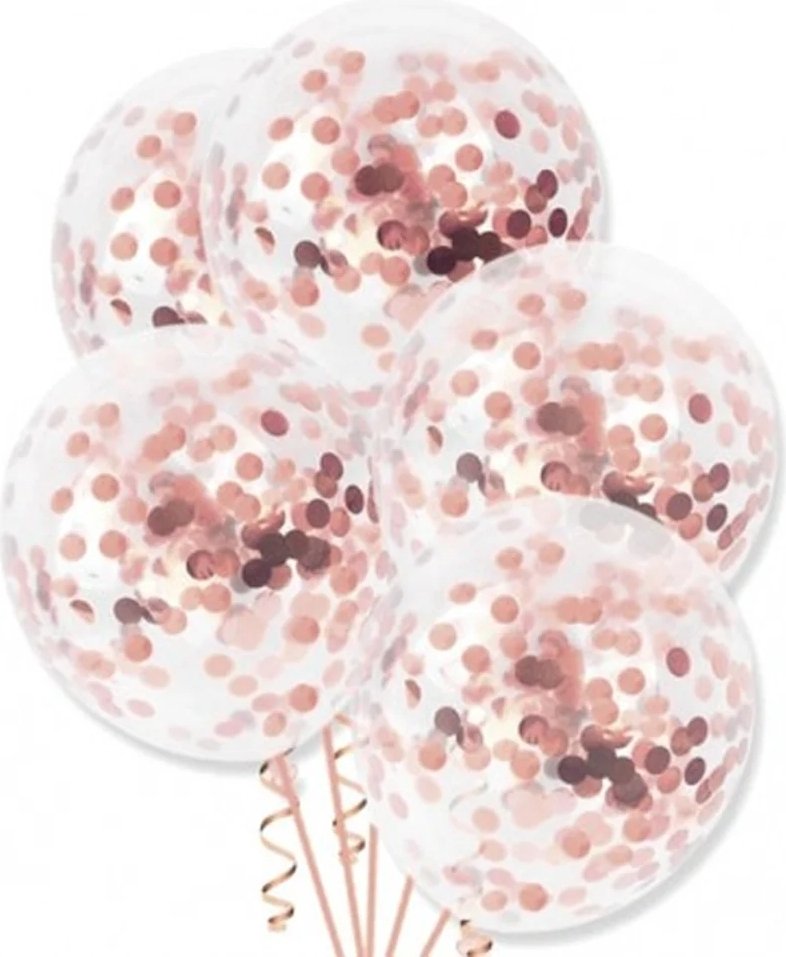 Vakre konfettiballonger med roségullkonfetti. Inneholder 4 ballonger. Ballongene vil være omtrent 30 cm ubundet. Kan blåses opp med luft eller helium.