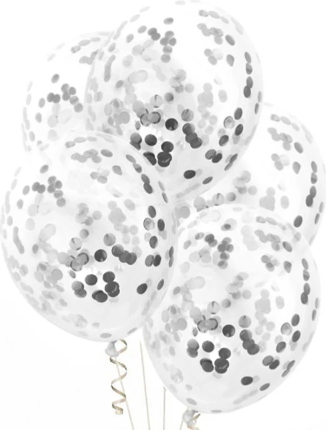 Vakre konfettiballonger med sølvkonfetti. Inneholder 4 ballonger. Ballongene vil være omtrent 30 cm ubundet. Kan blåses opp med luft eller helium.