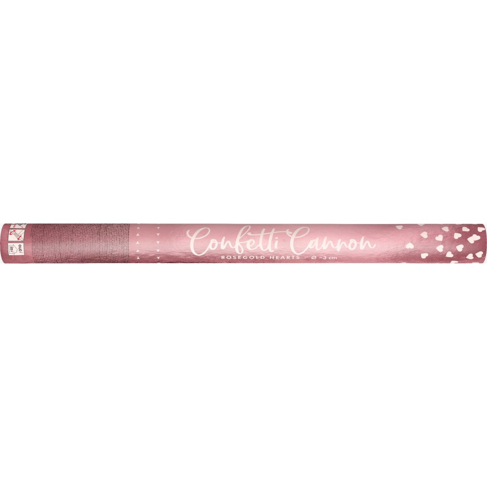 Konfettikanon i roségull med rosehjerter som vil gjøre festen din ekstra spesiell! Røret er ca. 60 cm langt og skyter konfettien ca. 5-8 meter med trykkluft.
