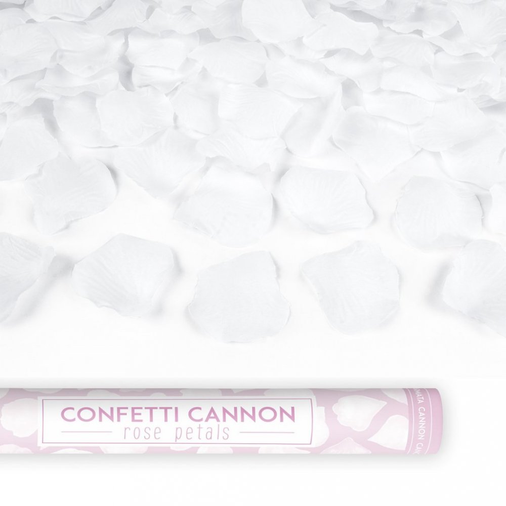 Konfettikanon med kunstige roseblader i hvitt - gjør det ekstra spesielt på festen! Røret er ca. 60 cm langt og skyter konfettien ca. 5-8 meter ved hjelp av trykkluft.