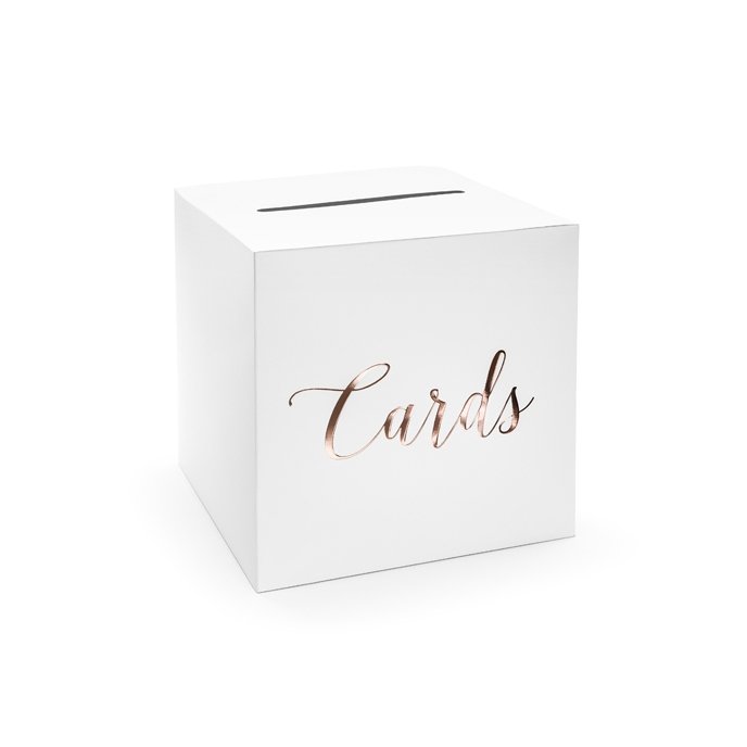 Korteske i hard papp med tekst i roségull. Så fin på gavebordet for gjestene å legge kortene sine i eller bruke som en eske med rådskort.
