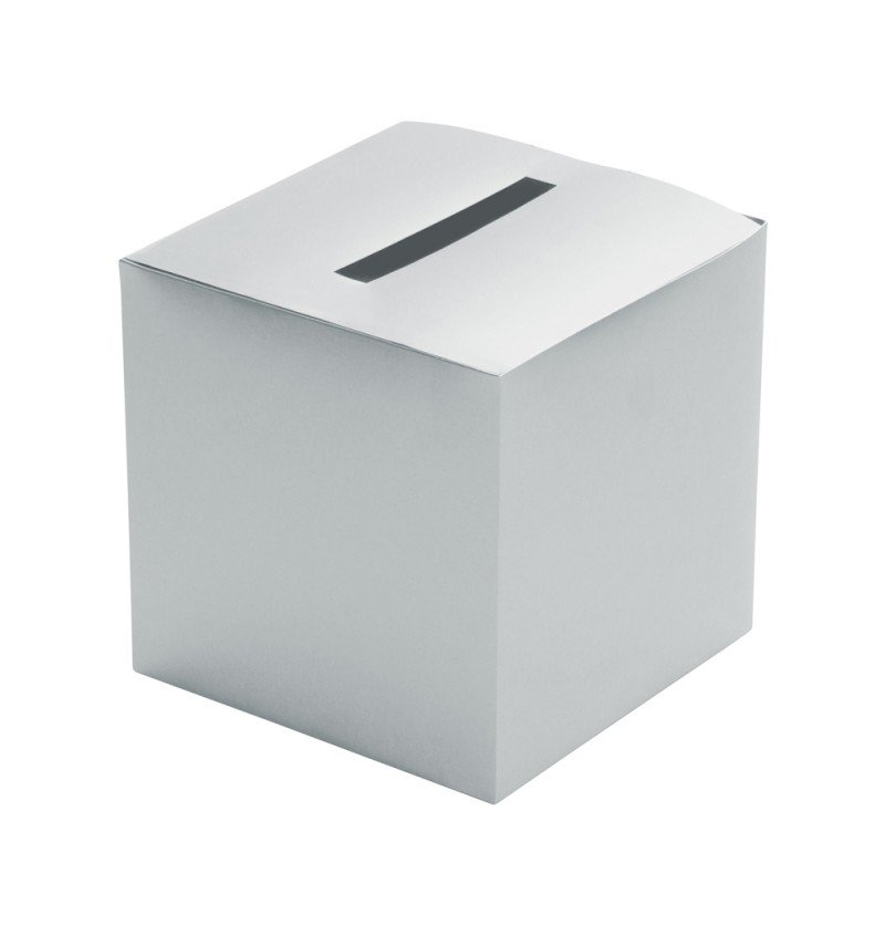 Korteske i matt sølvfarget papp. Så fin på gavebordet for gjestene å legge kortene sine i eller bruke som en eske med rådskort.