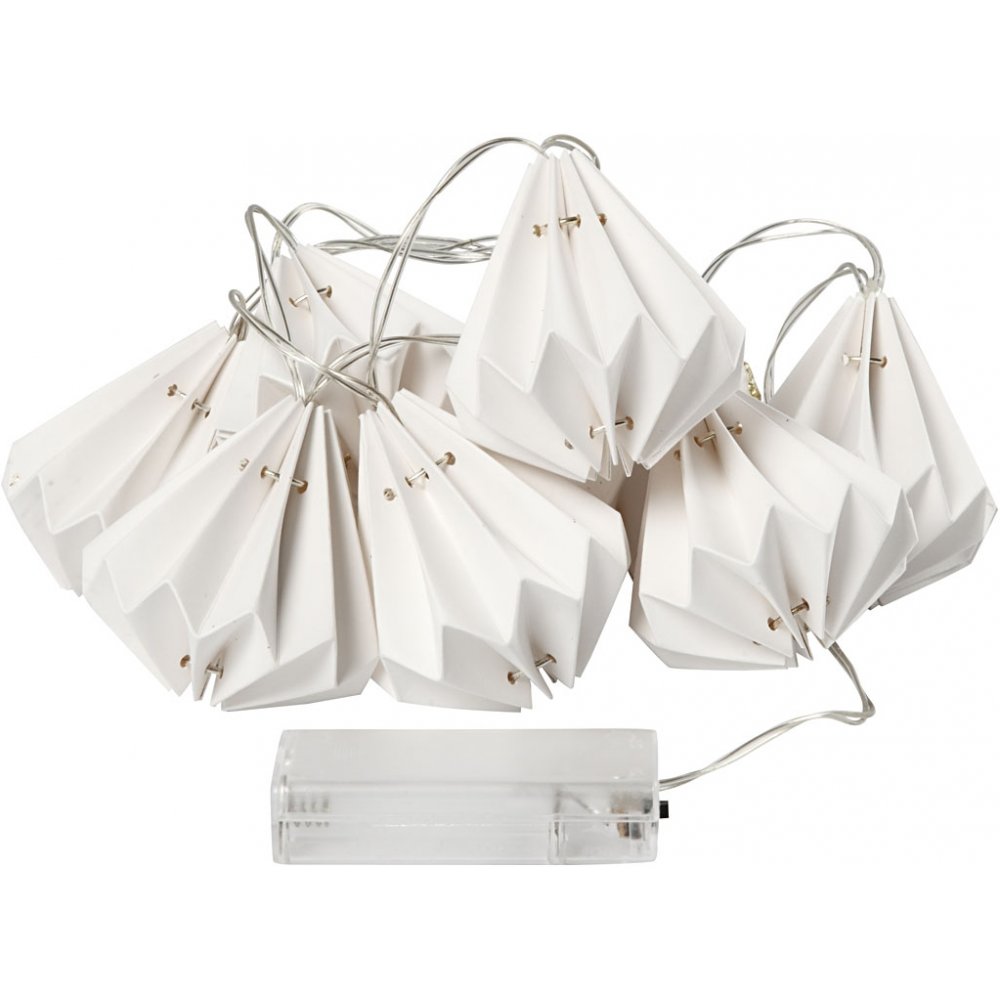 Batteridrevet lyslenke med gjennomsiktig ledning og 10 LED-lys. Alt i små, hvite lampeskjermer som er brettet av solid papp. Krever 2 AA-batterier (ikke inkludert).