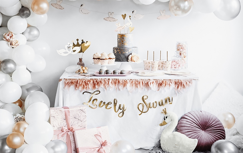 6-pakning med ballonger i rosa og gull - små søte svaner trykt på.