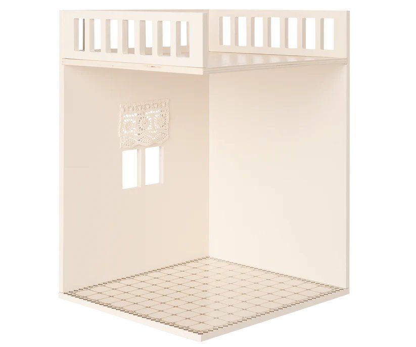 Miniatyrbaderom fra Maileg, med et fint mønstret gulv og et søtt forheng, egnet for å bygges sammen med det større huset fra samme kolleksjon. Komplett med møbler fra Maileg.