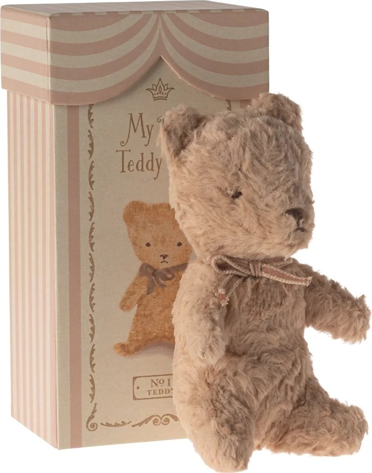 «Min første teddybjørn» er perfekt laget for små hender. Laget av myk kvalitet og har et farget bånd rundt halsen. Pakket i en vakker gaveeske hvor du kan legge til fødselsinformasjon inni. Perfekt gave til babyshower eller dåp.