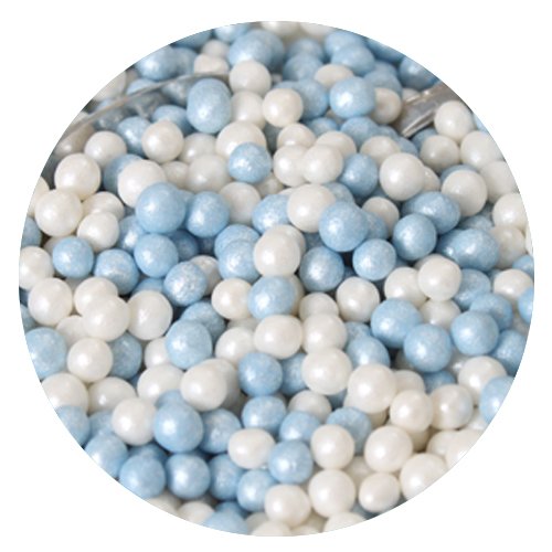 Myke sukkerperler med perlemorseffekt i lyseblått og hvitt. Perlene er myke og passer