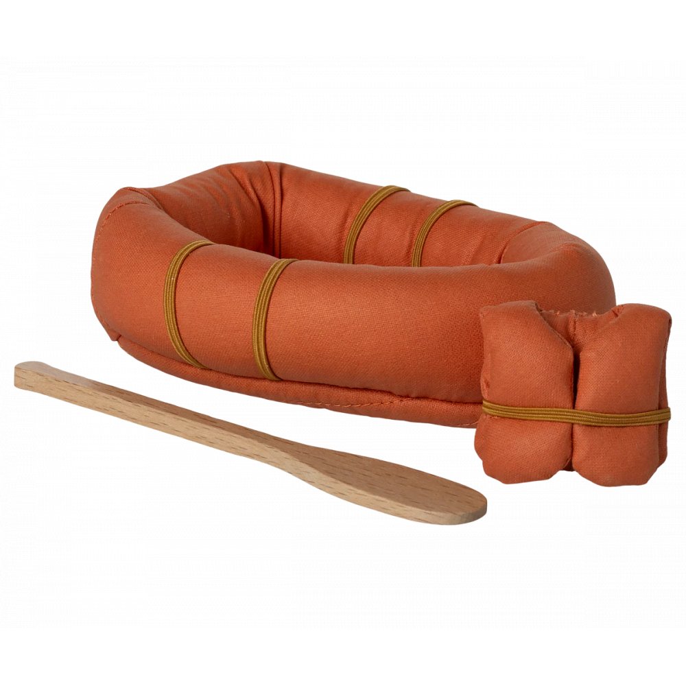 Supersøtt tilbehørssett til dukkene fra Maileg. Båt med padleåre og redningsvest.