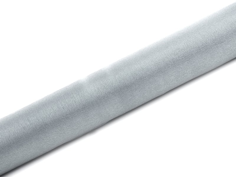 Sølvfarget organzastoff på rull.