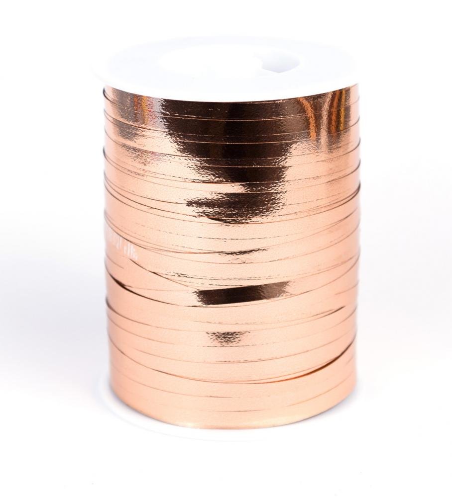 Pakkesnor/ballongsnor i metallisk roségull. Ledningen er 5 mm bred og rullen består av hele 500 meter.