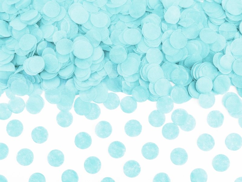 Papirkonfetti laget av lyseblått silkepapir. Sirklene er omtrent 1,6 cm i diameter.