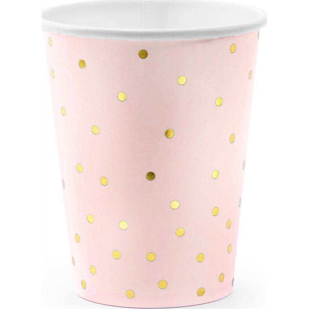 6-pakning med pappkrus i lys rosa med prikker i gullmetallic.